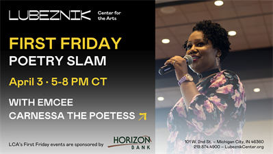 Poets interested in participating in LCA’s Poetry Slam should prepare three original pieces, each under three minutes in length and register by contacting Jessie Sexton at jsexton@lubeznikcenter.org, or call 219.874.4900 ext 107.